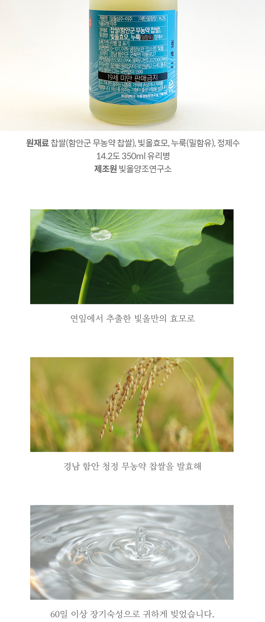 직접 배양한 빛올효모 만의 풍만한 산미와 균형잡힌 맛과 향, 경남 함안 친환경 찹쌀로 만든 순곡주