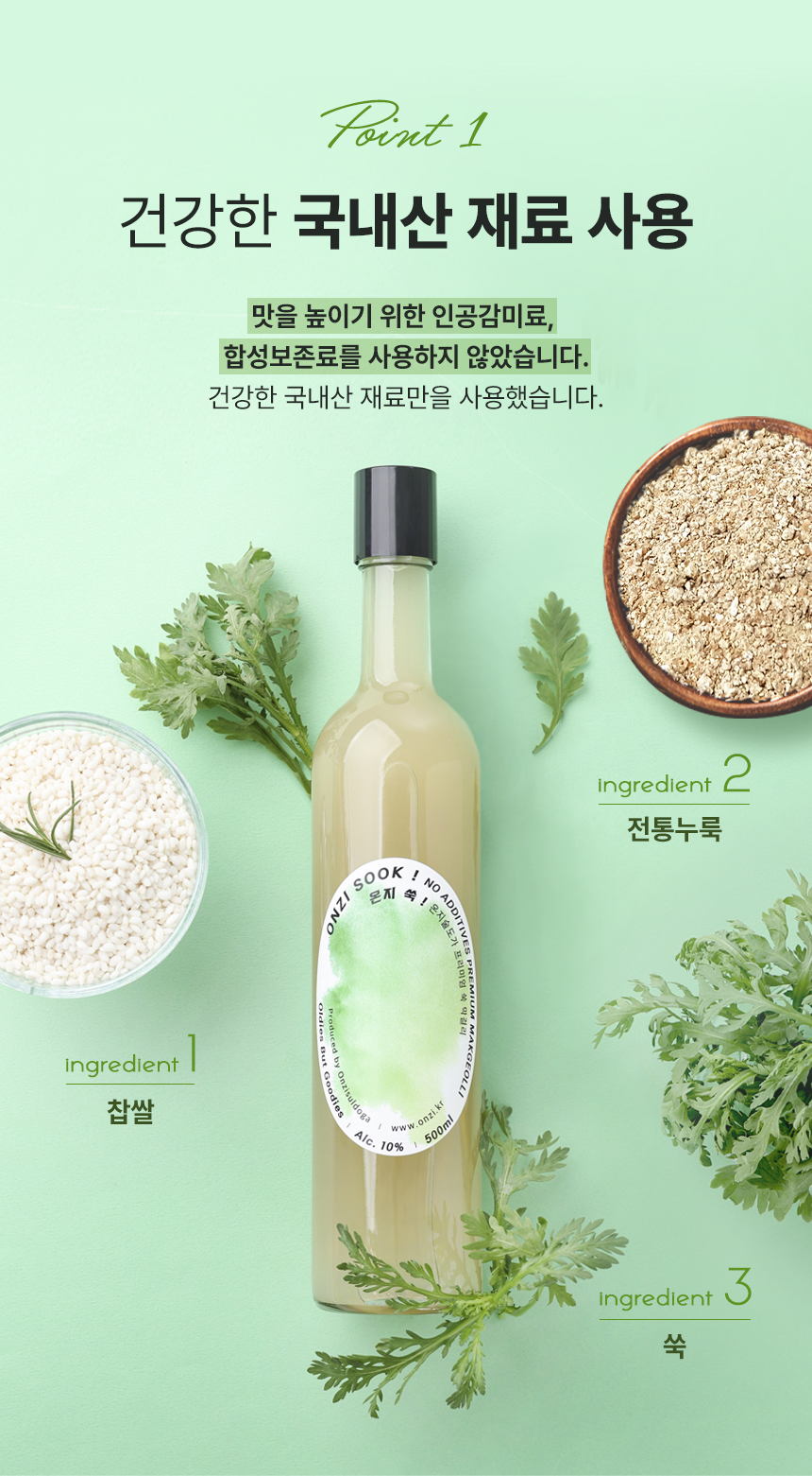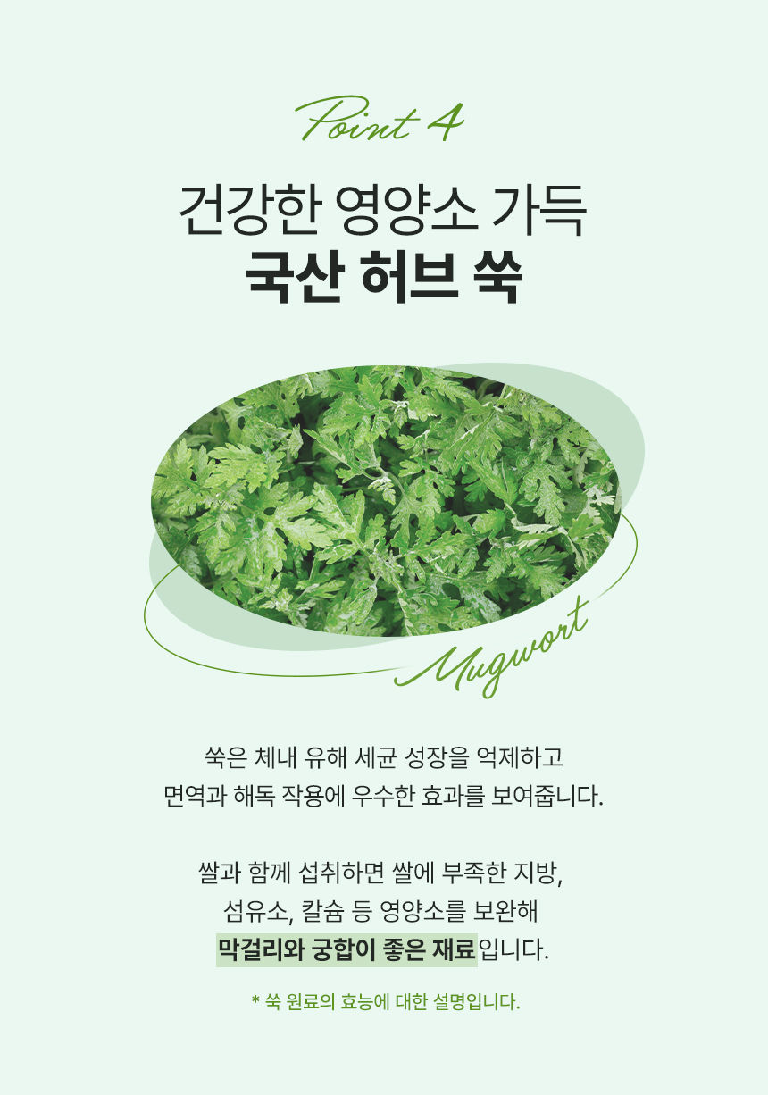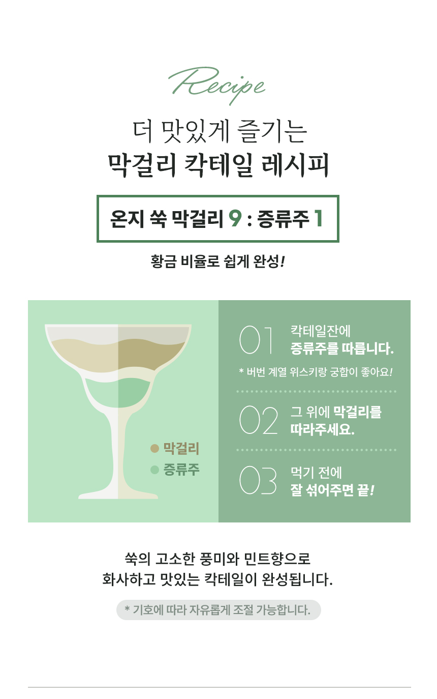원재료 정제수, 찹쌀, 고구마, 감자, 쑥, 누룩 (밀함유)